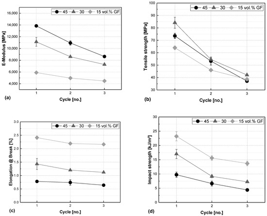 Elastic modulus (a), tensile strength (b), elongation at break (c), and unnotched impact strength (d) vs. processing cycle number of glass-fibre-reinforced composites made from organosheets with a fibre share of 45, 30, and 15 vol.%. (Remark: Some error bars given in the figure are smaller than the symbol size).