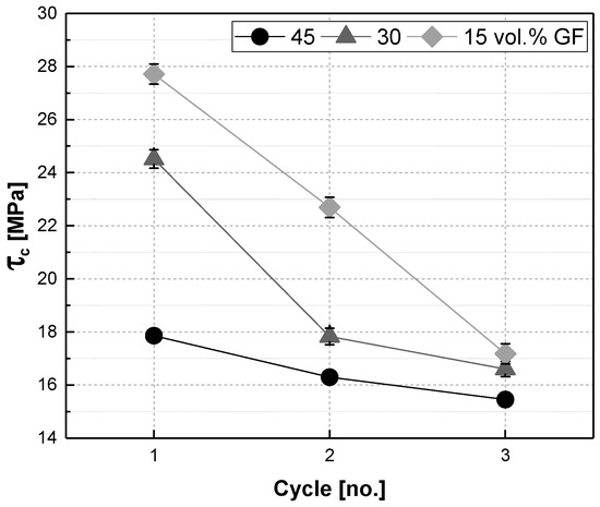 Interfacial shear strength (τc) values calculated with a modified Kelly–Tyson equation vs. processing cycle number for glass-fibre-reinforced composites made from organosheets with a fibre share of 45, 30, and 15 vol.% (Remark: Some error bars given in the figure are smaller than the symbol size.).