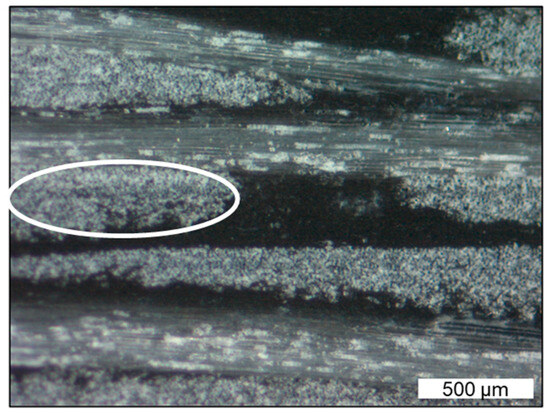 Micrograph of an organosheet cross-section, 40 times magnified, with the layers of the glass-fibre rovings going in both directions (parallel to the picture and coming out of it). One fibre bundle, consisting of several hundred single glass-fibre strands, coming out of the plane of the picture is marked with a white ellipse.