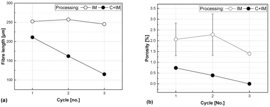 Fibre length (a) and porosity (b) vs. processing cycle number of glass-fibre-reinforced composites made from organosheets by injection moulding (IM) or additional compounding before injection moulding (C+IM) with a fibre share of 45 vol.%. (Remark: Some error bars given in the figure are smaller than the symbol size).