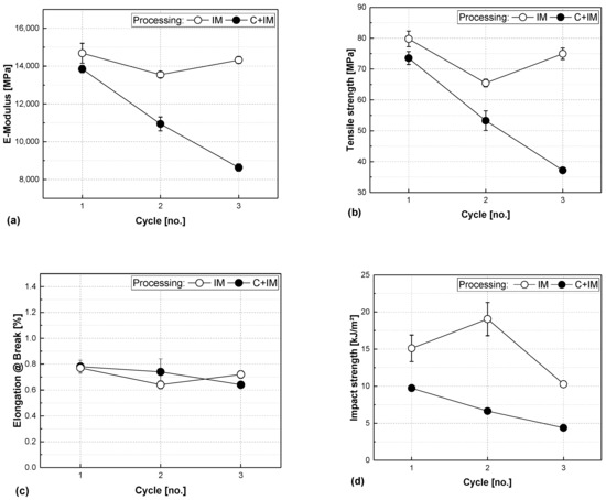 The results of the tensile test and impact strength are compared in Figure 7. For all measured parameters, C+IM samples exhibit a more or less linear decrease. The values for E-modulus, tensile strength, and impact strength are almost halved from processing round 1 to processing round 3. The IM series behaves quite differently: for the E-modulus, tensile strength, and elongation at break, there is also a drop from round 1 to round 2. However, after that, the values rise again in round 3 instead of continuing to fall as in the C+IM series. In all cases, the values of round 3 remain slightly below the initial round 1 values. Impact strength decreases more sharply from round 1 to processing round 3 by about a third of the values. However, the samples of cycle 2 show a peak in impact strength that is even higher than the initial value in cycle 1.