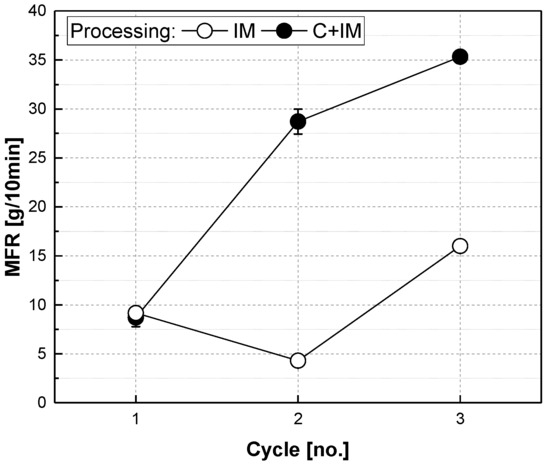 Measurements of the melt flow rate in Figure 8 show a similar trend to the mechanical tests. Whereas the MFR of the C+IM series increases almost linearly with progressing cycles, most likely due to the PP matrix degrading in the process and the fibre length reductions, the values for the IM series rise, but also have a familiar deviation in round 2, which can most likely be attributed to the improved dispersion of the fibre bundles from the original organosheet.