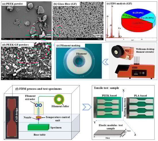 Microstructural characterization of the raw materials and schematic representation of the experimental procedure: (a) SEM micrograph of PEEK powder; (b,c) SEM micrograph and corresponding EDS analysis of GF; (d) SEM micrograph of the blended powder mixture; (e) schematic illustration of the filament fabrication process; and (f) schematic diagram of the additive manufacturing technique utilized for PLA- and PEEK-based composites, alongside the configuration of the test specimens.