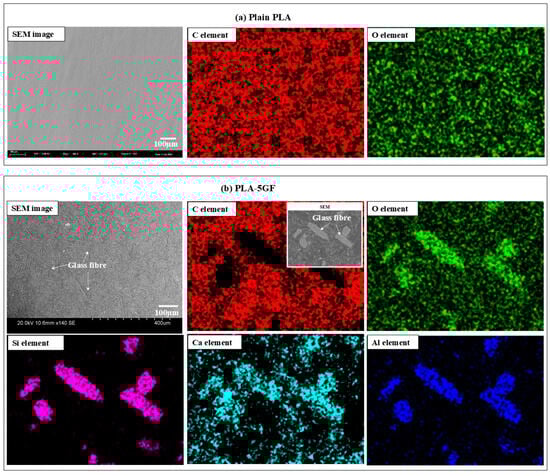 Figure 2 presents a detailed microstructural evaluation that elucidates the morphological and compositional characteristics of the PLA-based composites. As shown in Figure 2a, the SEM micrograph of the pure PLA revealed a relatively smooth and homogeneous surface. The corresponding EDS elemental mapping predominantly exhibited peaks for carbon (C) and oxygen (O), aligning with the expected elemental composition of pure PLA matrix. Conversely, Figure 2b illustrates the microstructure of the PLA composite reinforced with 5GF, where the presence of embedded fibrous structures was clearly evident, confirming the successful incorporation of the reinforcement phase into the polymer matrix. The EDS mapping of this composite indicated a heterogeneous distribution of elements, with prominent signals corresponding to silicon (Si), aluminum (Al), oxygen (O) and calcium (Ca)—key constituents of the glass fibre—thereby verifying their uniform dispersion within the polymer matrix. These observations confirmed the structural integrity of the composite and demonstrated the efficacy of the fabrication process.