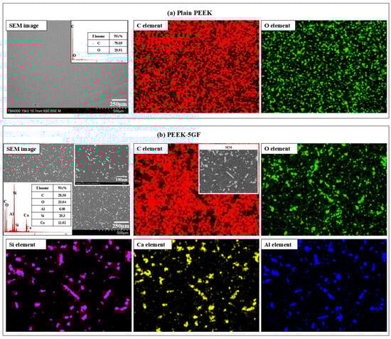 Microstructural characterization of PEEK-based composites: (a) SEM micrograph accompanied by EDS mapping and corresponding elemental analysis of the pure PEEK; (b) SEM micrograph, EDS mapping, and elemental analysis of the PEEK-5GF composite, illustrating the dispersion of GF and elemental distribution within the polymer matrix.