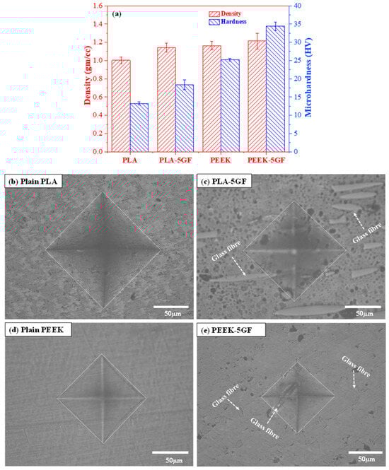 Microhardness characterization of PLA- and PEEK-based composites: (a) comparative analysis of relative density and microhardness values for PLA- and PEEK-based composites; representative optical micrographs of residual indentation imprints on the surfaces of (b) PLA, (c) PLA-5GF, (d) PEEK and (e) PEEK-5GF composites, respectively, illustrating the deformation response under applied load.