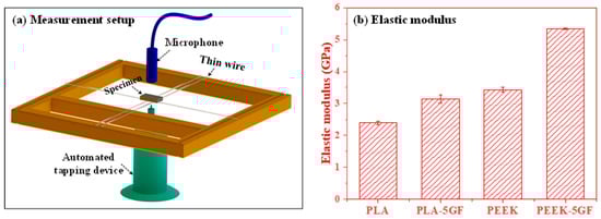 (a) Schematic representation of the experimental setup for measuring the elastic modulus using impulse technique and (b) the associated elastic modulus values of the PLA and PEEK-based composites, highlighting the effect of the GF reinforcement on the mechanical properties.