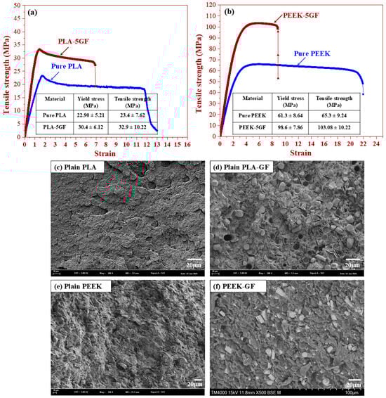 Mechanical properties and fracture surface characterization of polymer composites: (a) stress–strain curve of PLA-based composite; (b) stress–strain curve of PEEK-based composite; and SEM images of the fracture surfaces of (c) plain PLA, (d) PLA-5GF, (e) plain PEEK and (f) PEEK-5GF.