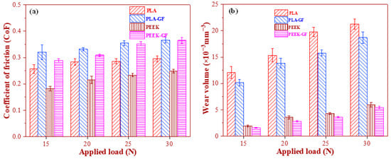 Comparative assessment of the tribological behavior of polymer composites conducted through micro-scratch testing. (a) Coefficient of friction (CoF) and (b) wear loss of PLA-based and PEEK-based composites as a function of the applied load.