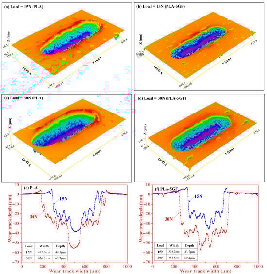 Following the micro-scratch testing, the wear tracks of plain PLA and PLA-5GF were examined using a 3D surface profilometer integrated in the MFT-5000 platform (Rtec Instruments, San Jose, CA, USA) as shown in Figure 8. Under a nominal load of 15 N (Figure 8a,b), plain PLA exhibited a broad with pronounced pile-up, reflecting extensive plastic flow. In contrast, PLA-5GF showed a narrower, more defined track due to the constraint imposed by dispersed fibres, which limited chain mobility and localized deformation. At 30 N (Figure 8c,d), deformation increased in both systems, yet differences persisted: plain PLA revealed a wider groove with micro-tearing and delamination, whereas PLA-5GF maintained a shallower, more stable track. Quantitative profilometry (Figure 8e,f) confirmed these trends, with plain PLA showing a depth of ~69.7 µm and width of ~626.3 µm, compared to ~60.2 µm and ~481.5 µm for PLA-5GF. These results highlight that GF reinforcement enhances resistance to scratch-induced deformation by improving load distribution and suppressing localized plastic flow.