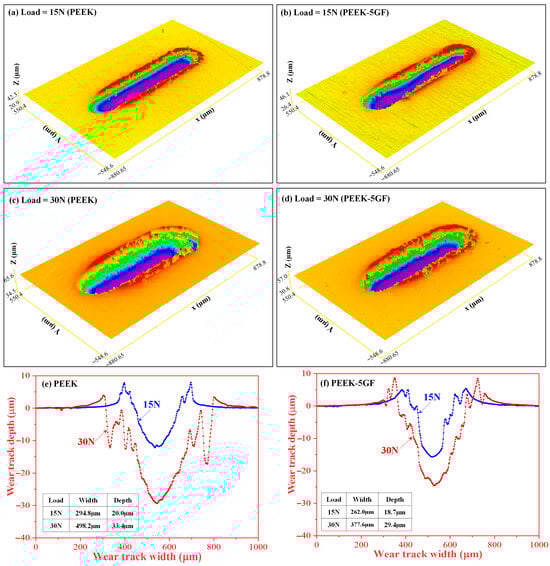 Figure 7b further corroborate these findings by illustrating the wear loss characteristics of each system. The results clearly indicated that the PLA-based materials experience significantly greater material removal compared to their PEEK-based counterparts, thereby underscoring the inferior wear resistance of the PLA matrix. Quantitatively, the wear volume of plain PLA at nominal forces of 15 N and 30 N was measured to be approximately 12.09 ± 1.12 × 10−3 mm3 and 21.25 ± 0.94 × 10−3 mm3, respectively. In contrast, the incorporation of GF into the PLA matrix leads to reduce in wear loss, with PLA-5GF exhibiting wear volumes of 10.15 ± 0.64 × 10−3 mm3 at 15 N and 18.68 ± 1.09 × 10−3 m3 at 30 N. This improvement can be attributed to the reinforcing effect of GF, which enhanced the load-bearing capacity of the matrix and introduced a degree of mechanical interlocking that mitigates excessive material removal. Similarly, the PEEK-based composites demonstrated better wear performance. For plain PEEK, the wear volumes were approximately 1.94 ± 0.21 × 10−3 mm3 at 15 N and 5.96 ± 0.39 × 10−3 mm3 at 30 N. With the addition of GF, these values further decrease to 1.59 ± 0.064 × 10−3 mm3 and 5.46 ± 0.21 × 10−3 mm3, respectively, indicating that the GF reinforcement is similarly effective in enhancing the wear resistance of the PEEK matrix. Notably, the wear volume of PEEK-based composites remains an order of magnitude lower than that of PLA-based systems under all tested conditions, reflecting the intrinsic superiority of PEEK in tribological applications.