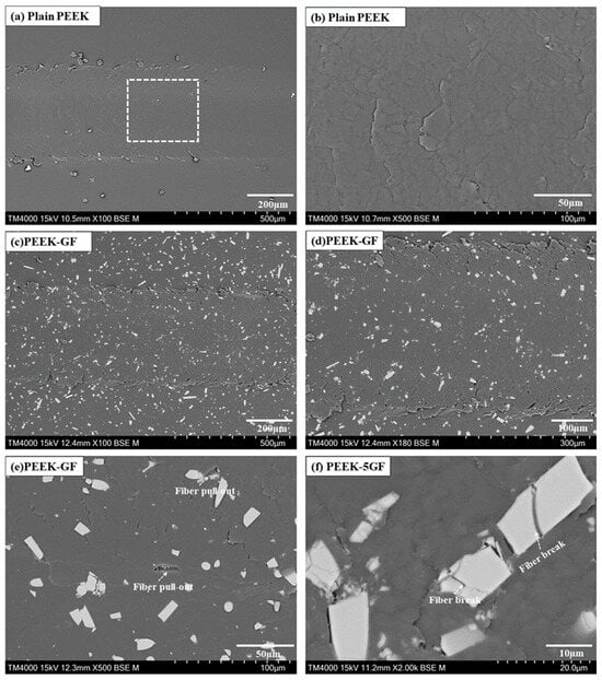 By contrast, the PEEK-5GF specimens demonstrated distinctly different surface characteristics. The scratch tracks revealed clear evidence of fibre-mediated damage mechanisms, including fibre pull-out and fracture, as obvious in Figure 10c–f. The presence of partially embedded and protruding fibre fragments, alongside voids resulting from fibre detachment, as marked in Figure 10e, suggested interfacial debonding and insufficient load transfer across the fibre–matrix interface during tribological contact. Moreover, the alignment of broken fibre fragments along the scratch direction, as observed in Figure 10f, further supports the occurrence of localized brittle fracture within the reinforcing phase under high contact stresses. These findings collectively underscore the critical role of reinforcing fibres in modulating the deformation response and damage evolution of the composite during tribological loading. The transition from homogeneous plastic flow in the plain PEEK to a more intricate failure mechanism in the fibre-reinforced counterpart, characterized by matrix deformation, interfacial decohesion, and fibre fracture, highlights the complex interplay of constituent phases governing the scratch-induced wear behavior.