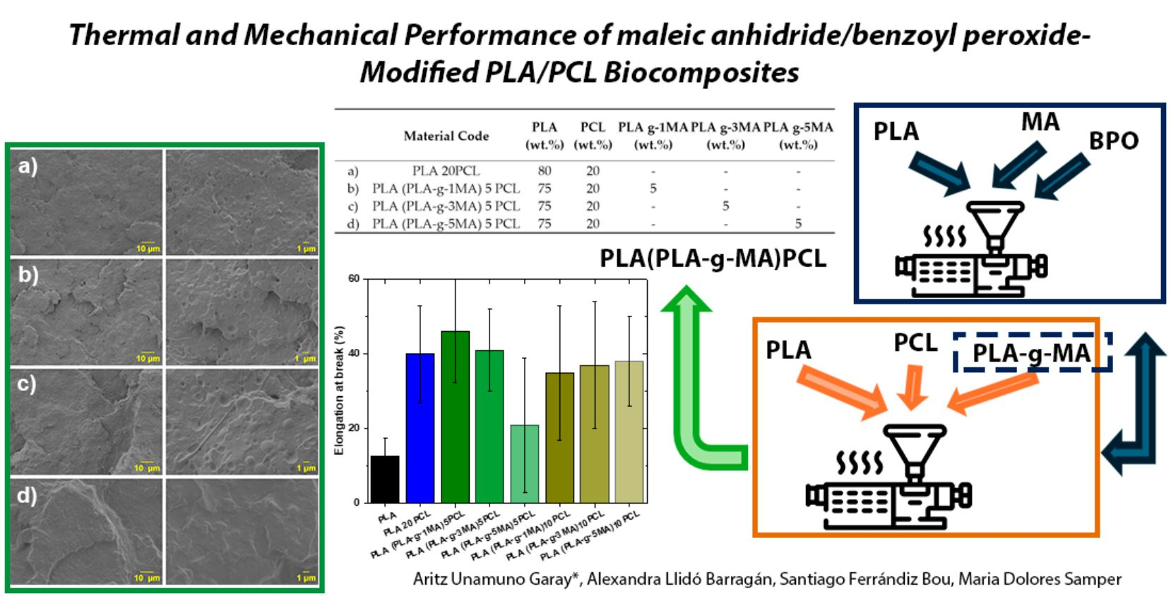 Overall, the addition of PCL significantly improves ductility, while PLA-g-MA also increases elongation at break, although with greater variability, which could indicate inconsistencies in the material’s structure or in phase dispersion.