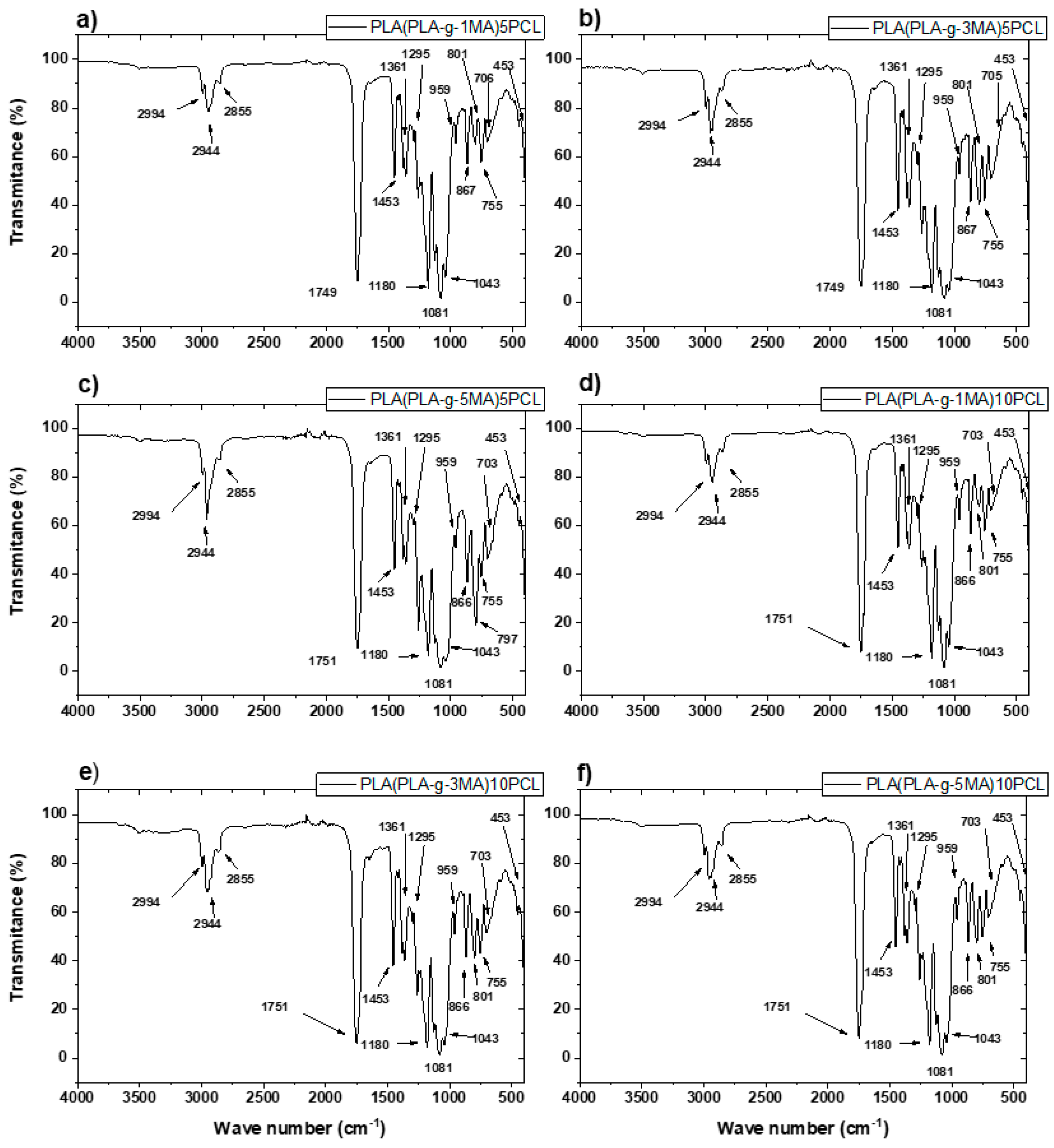 The FTIR spectra obtained from the PLA-g-MA/PCL formulations revealed several characteristic absorption bands corresponding to the chemical structures of poly (lactic acid) (PLA), polycaprolactone (PCL), and maleic anhydride (MA) (see