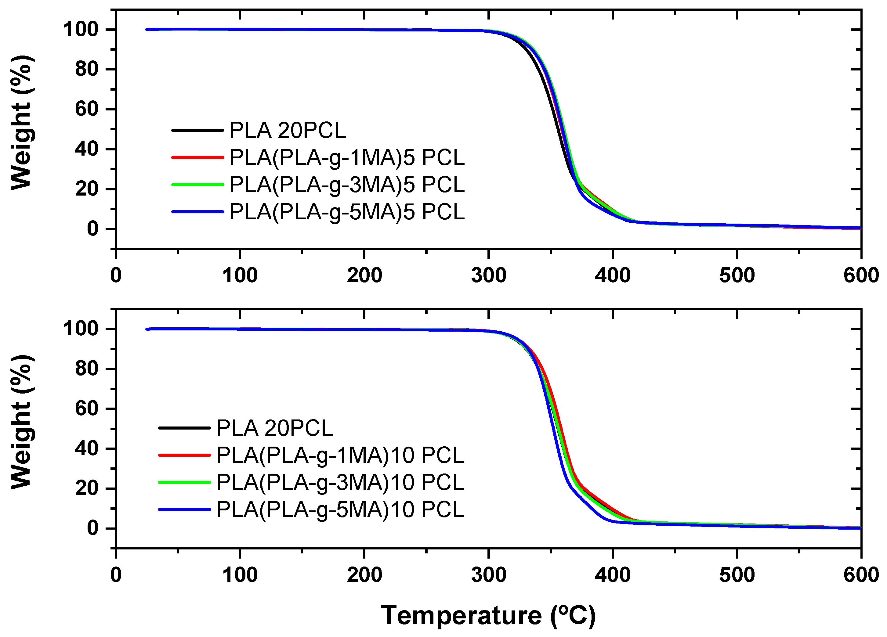 Thermogravimetric analysis (TGA) and its derivative (DTG) reveal the thermal behavior of PLA/PCL formulations with different concentrations of MA as a compatibilizer (see