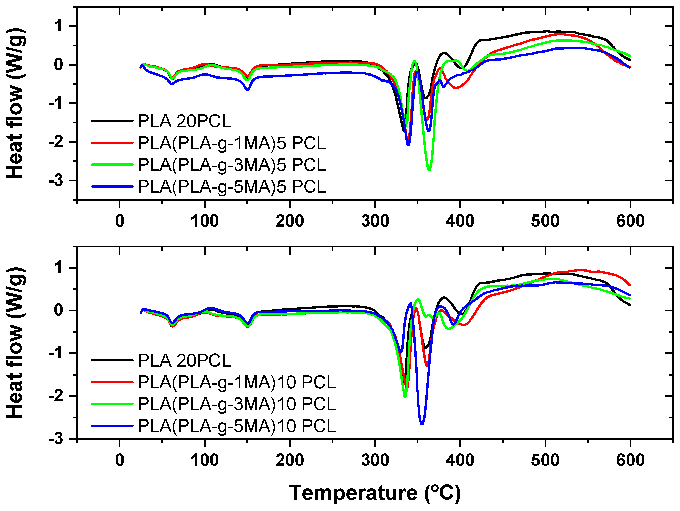 The thermal behavior of the PLA/PCL blends modified with different concentrations and types of maleic anhydride (MA)-grafted PLA (PLA-g-MA) was studied using differential scanning calorimetry (DSC). The results reveal how varying the compatibilizer type and amount influences the thermal transitions and crystallinity of the blends.