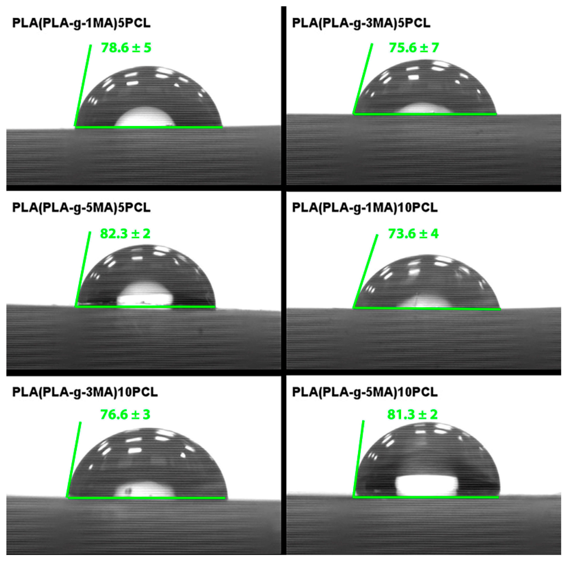 Finally, upon analyzing the PLA-(PLA-g-1MA)/10PCL, PLA-(PLA-g-3MA)/10PCL, and PLA-(PLA-g-5MA)/10PC SEM images (