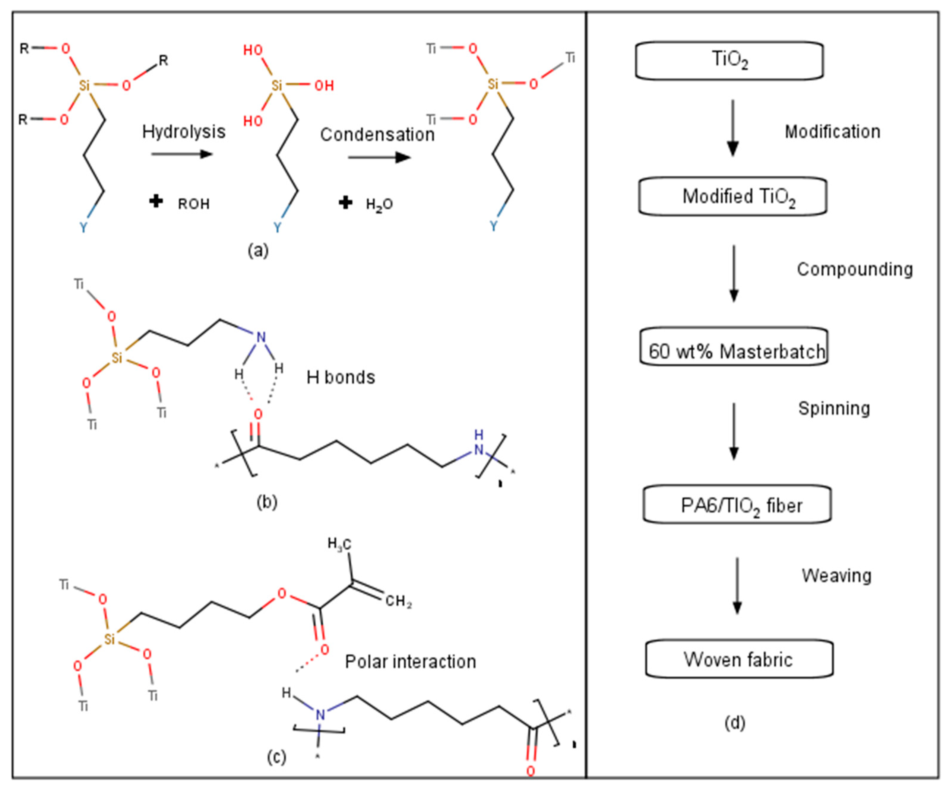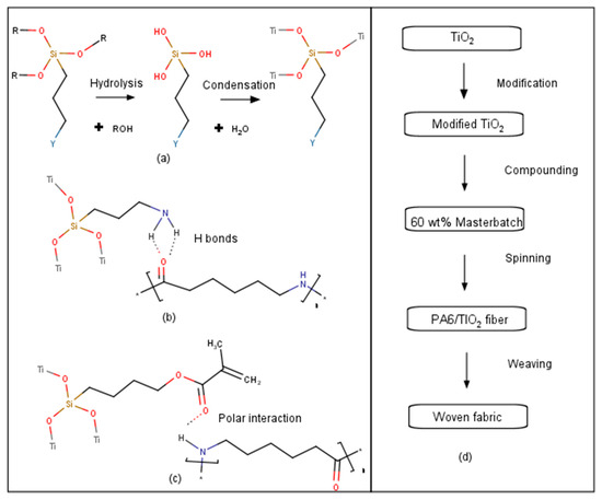 - Dalod, A.R.; Henriksen, L.; Grande, T.; Einarsrud, M.A. Functionalized TiO2 nanoparticles by single-step hydrothermal synthesis: The role of the silane coupling agents. Beilstein J. Nanotechnol. 2017, 8, 304–312. [Google Scholar] [CrossRef]