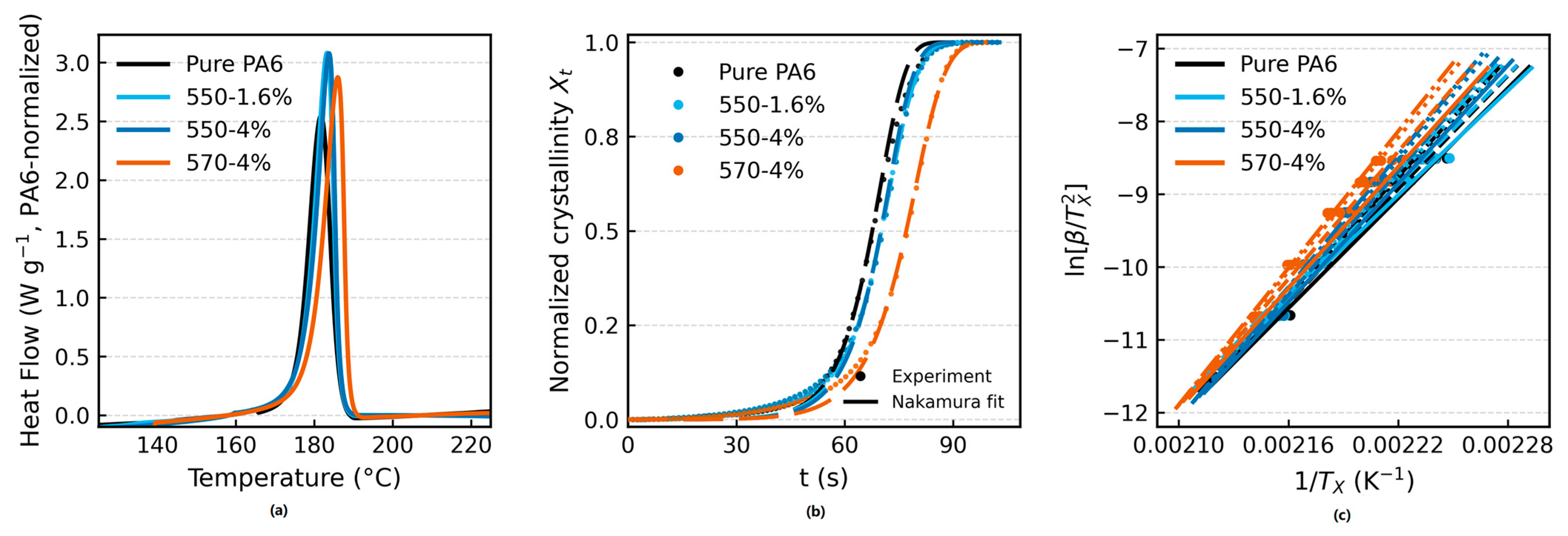 3.2.1. Non-Isothermal Crystallization Kinetics: Avrami–Nakamura and Isoconversional Analyses