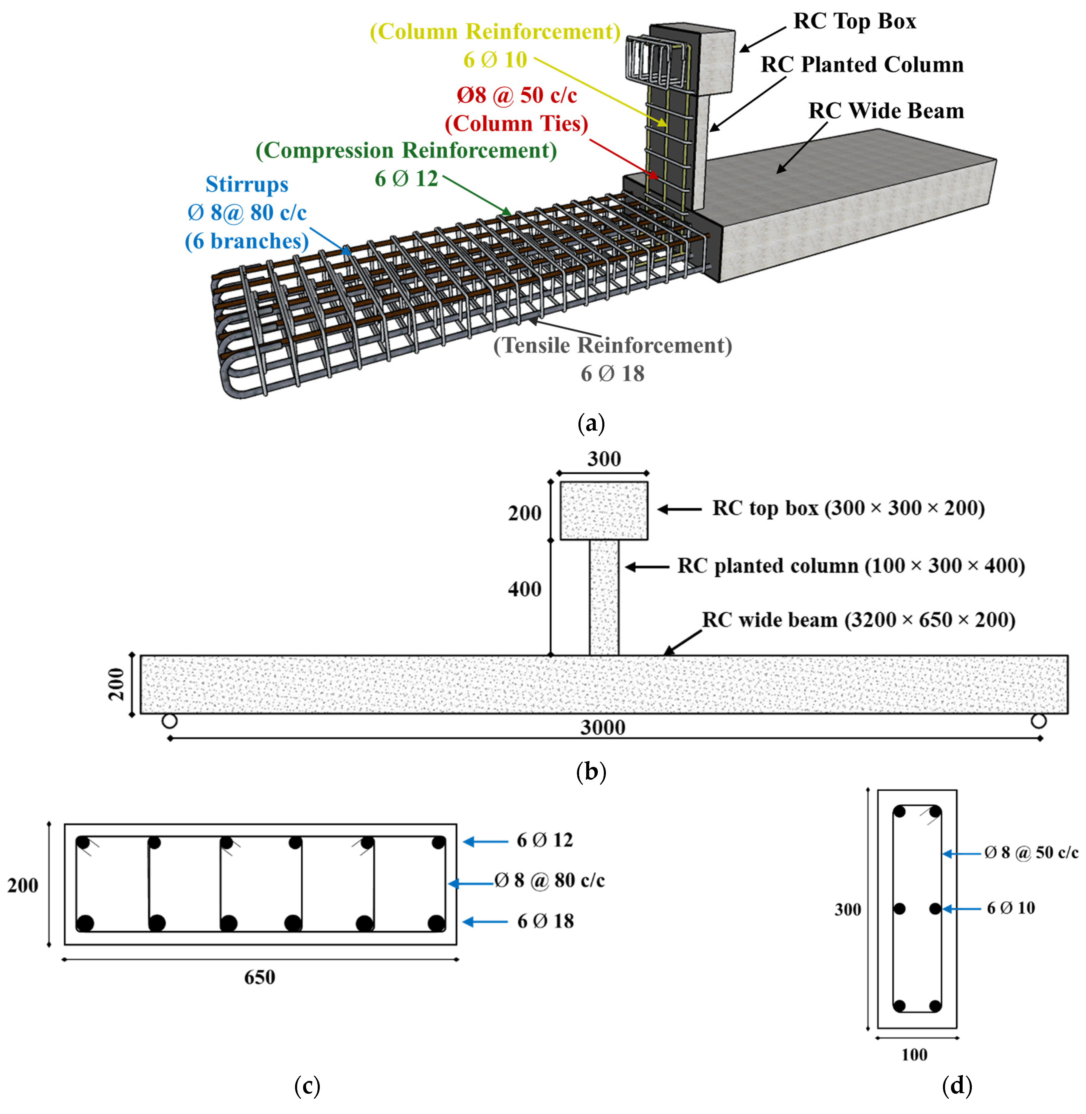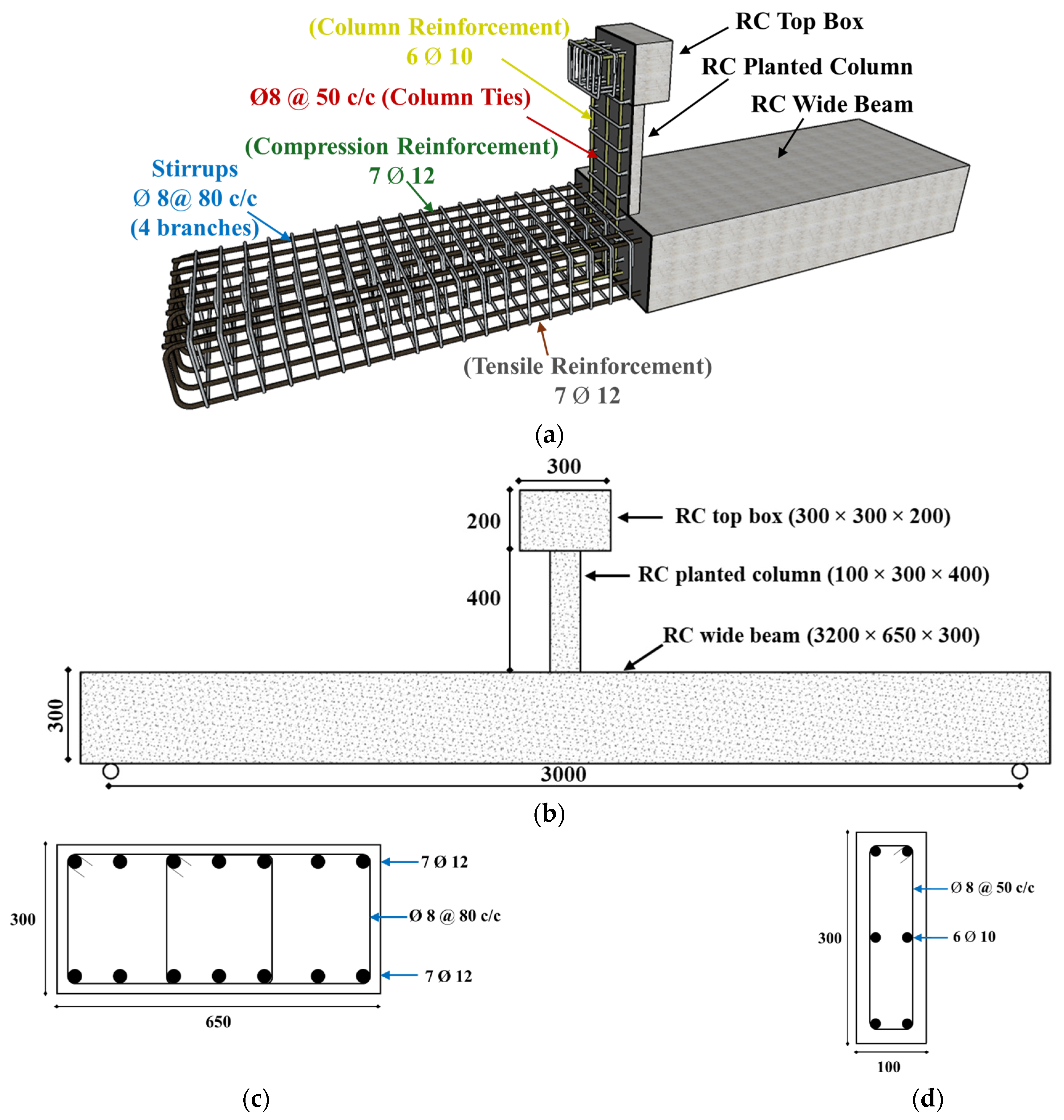 The specimen WB-CON was constructed with an RC planted column at its mid-span (Figure 2). The RC planted column has a rectangular section of 100 mm by 300 mm. It had an RC top box of dimensions 300 mm × 300 mm × 200 mm, as seen in Figure 2. The RC wide beam was reinforced with 6ϕ18 mm bars in tension and 6ϕ12 mm bars in compression, along with 6-leg stirrups of ϕ8 mm provided at 80 mm centers. The planted column was longitudinally reinforced with 6ϕ10 mm steel bars, along with ties of ϕ8 mm provided at 50 mm centers. As presented in Figure 2, the top box was heavily reinforced to avoid local failure during testing. WB-CON was designed as a half-scale representation of the concrete wide beams found in practice. As shown in Table 1 and Table 2, it satisfied the flexural and shear requirements of design codes [45,46] but exceeded the allowable deflection limit.