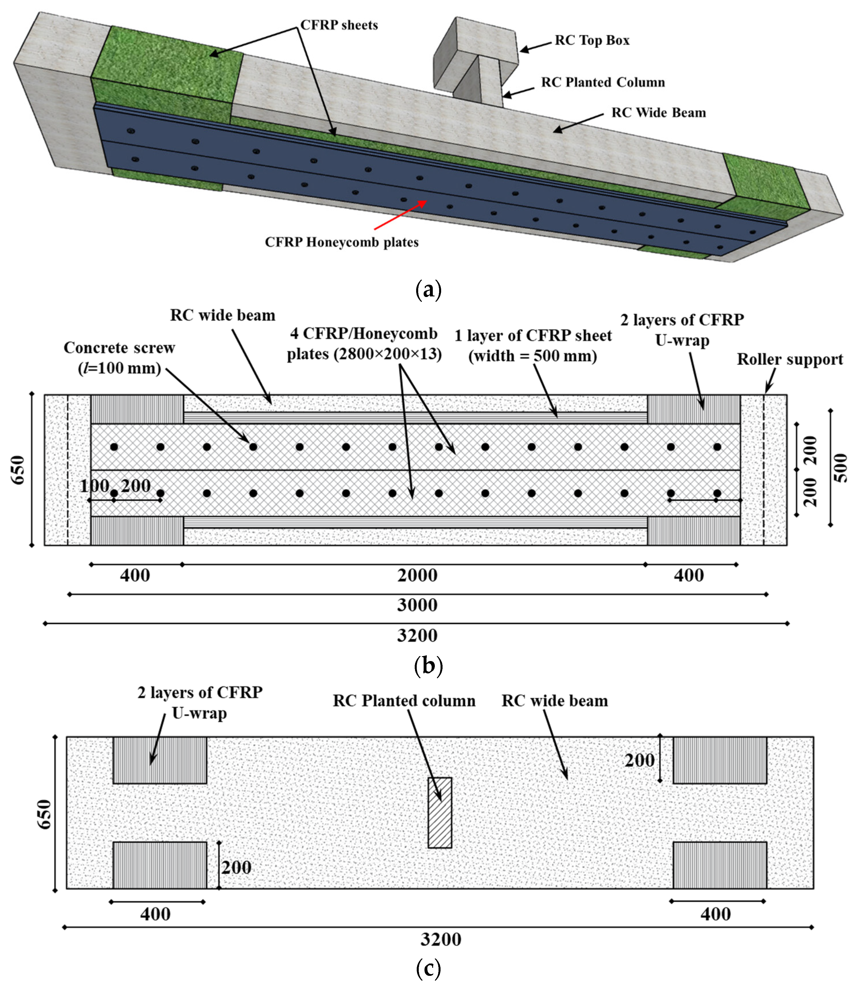 In the Middle East, RC joist slab systems with wide beams are widely used for residential floors. However, when these beams support planted columns, excessive deflection beyond code limits is often observed, despite adequate flexural and shear design. This paper experimentally assesses, for the first time, the efficacy of using carbon-fiber-reinforced polymer (CFRP) sheets alone versus a novel hybrid system comprising CFRP sheets and CFRP/honeycomb plates in controlling deflection in RC wide beams with planted columns. Four RC wide beam specimens at half-scale, each featuring a planted column, were tested to failure. Two control specimens, the first one was designed to reflect standard construction practices. It was sufficiently designed in flexure and shear, but its deflection exceeded code requirements. The second was designed to satisfy the code deflection requirements. The remaining specimens were strengthened using two different techniques: one with externally bonded CFRP sheets and the other with the hybrid system. The findings demonstrated a marked improvement in the flexural performance of the retrofitted wide beams, with peak load increases of 65–71%, stiffness gains of 63–67%, and reduced deflections meeting serviceability requirements (deflection at peak load was reduced by 45–48%). Furthermore, an analysis procedure was developed to estimate the flexural strength and deflection of these beams.