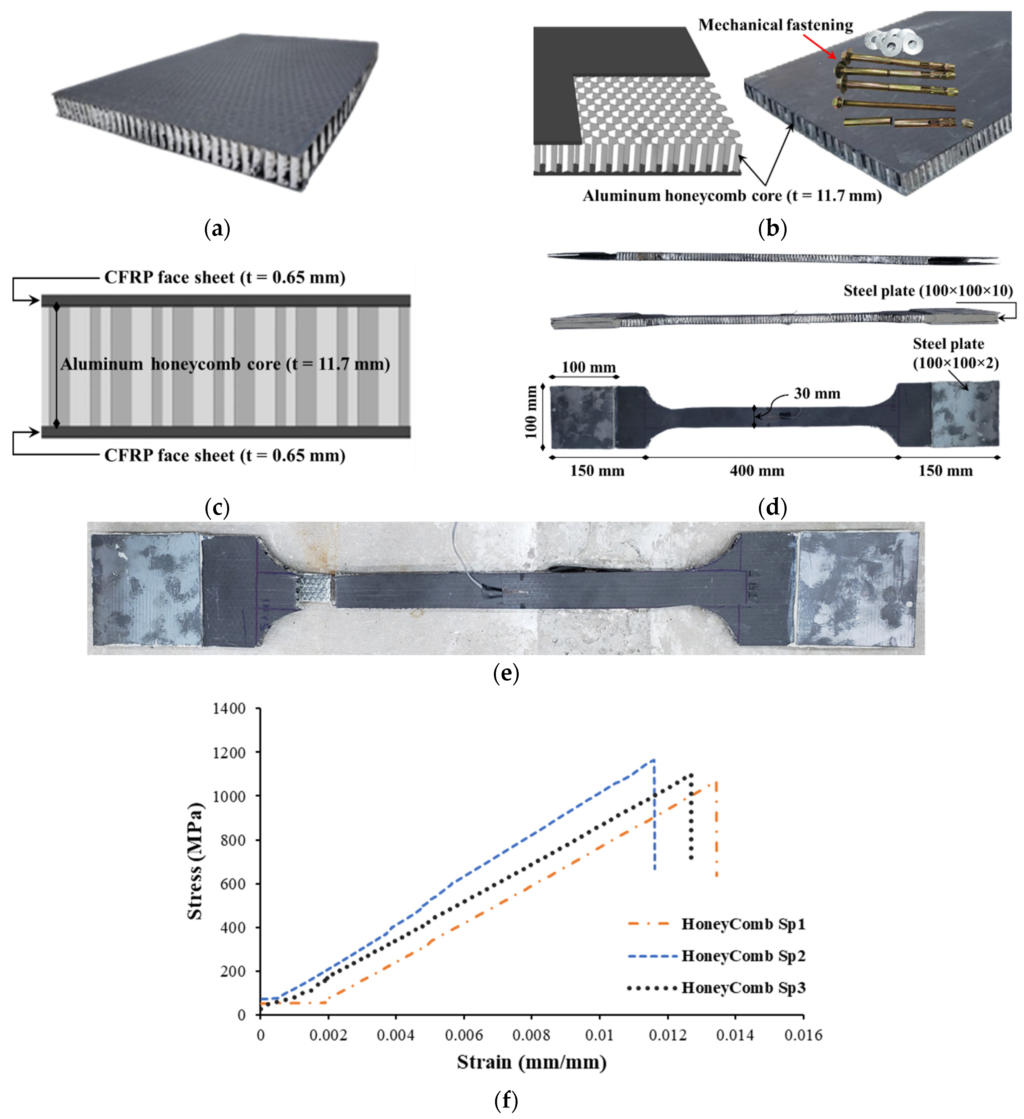 Although the aluminum core was fully isolated from contact with other potentially galvanically active materials, the only interface with steel occurs at the bolt shank, which is recommended to be epoxy-coated to prevent galvanic corrosion. As a result, galvanic corrosion is not anticipated in the adopted scheme. While environmental degradation and long-term creep of the CFRP-honeycomb system are relevant for service-life assessment, these effects were beyond the scope of the present short-term experimental program. These considerations are noted here to clarify the applicability and limitations of the results.
