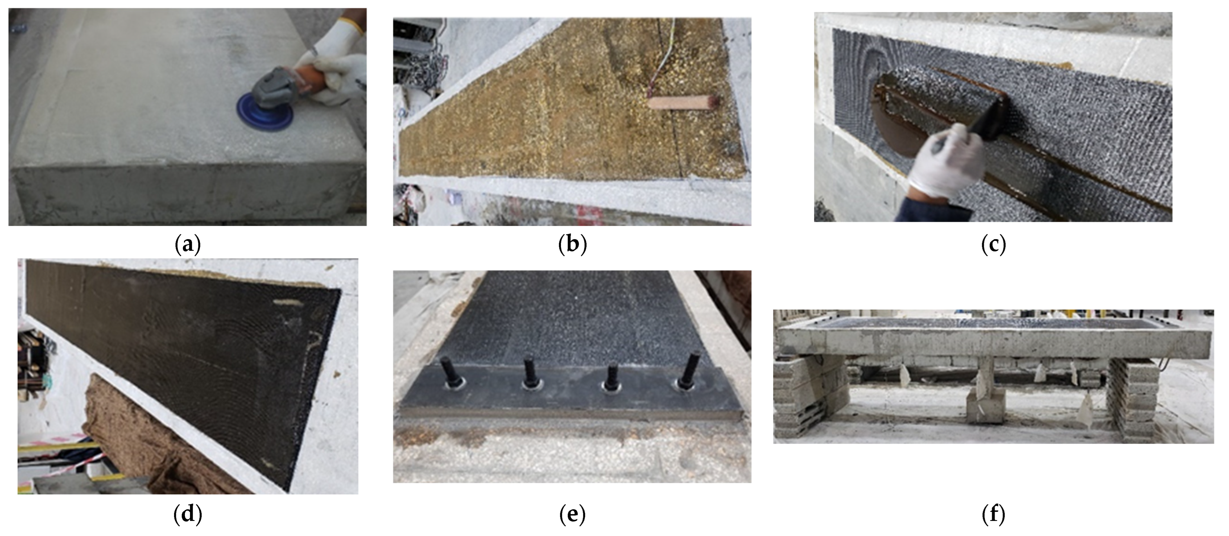 Reinforcing steel bars were prepared and inspected in accordance with the design specifications. Following this, the formwork was assembled, and strain gauges were affixed on selected reinforcement bars as specified in the instrumentation layout for test measurements. Final quality assurance checks were then conducted to confirm readiness for casting. Ready-mix concrete was supplied by a local producer, and all specimens were cast concurrently to eliminate variability between concrete batches. After curing of the wide beam with planted column specimens, the beams were prepared for strengthening. For this purpose, the beam surfaces were cleaned and sandblasted to remove all unevenness from the surfaces. After that, the specimens were ready for the strengthening process.