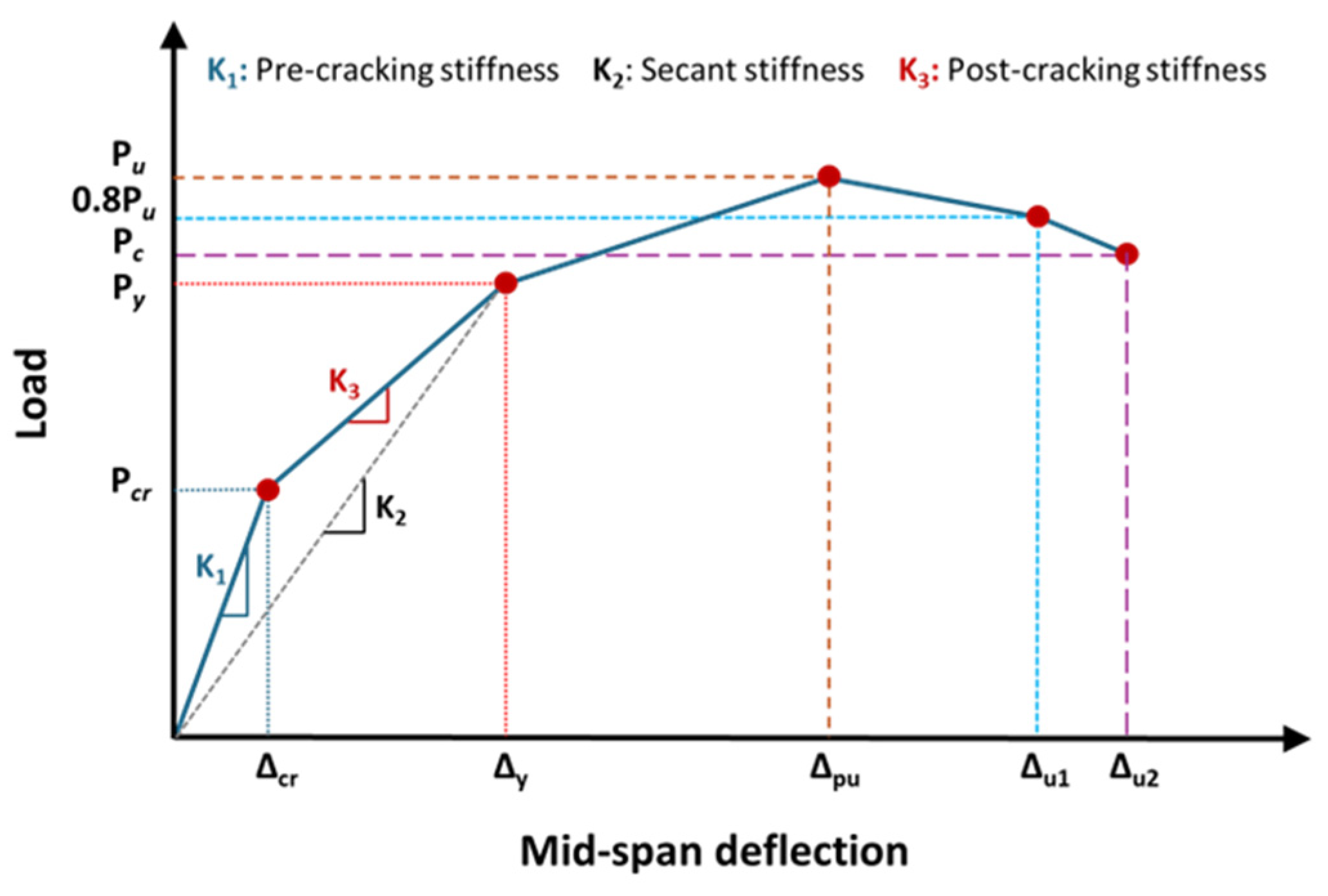 Table 5 illustrates the key experimental results of tested beams, including the first crack load (Pcr) and associated deflection (Δcr), the load at the initiation of yielding (Py) of the main tension reinforcement along with its associated deflection (Δy), the peak load (Pu) and corresponding deflection (Δpu), the deflection at the ultimate state (Δu1), and the observed failure mode. The ultimate state was assumed as the post peak point at which load is reduced by 20% (0.8Pu), as illustrated in Figure 10, where Pc and Δu2 are the load at concrete crushing and its associated deflection.