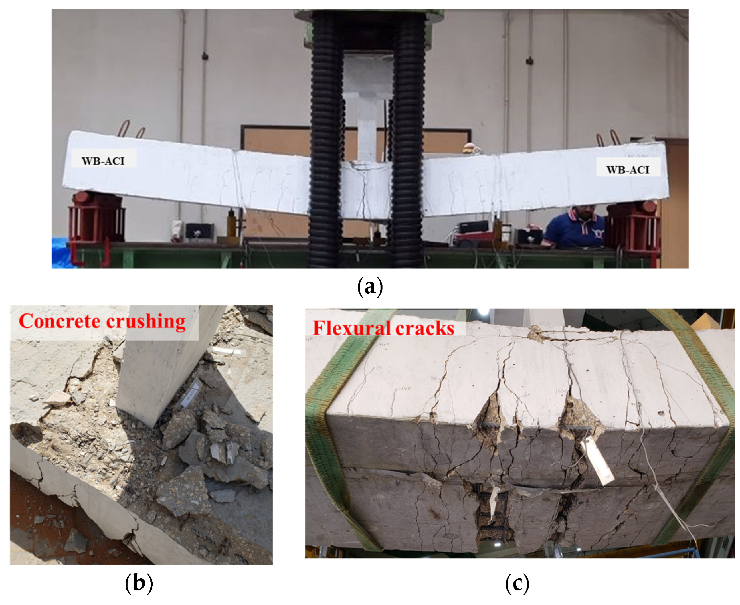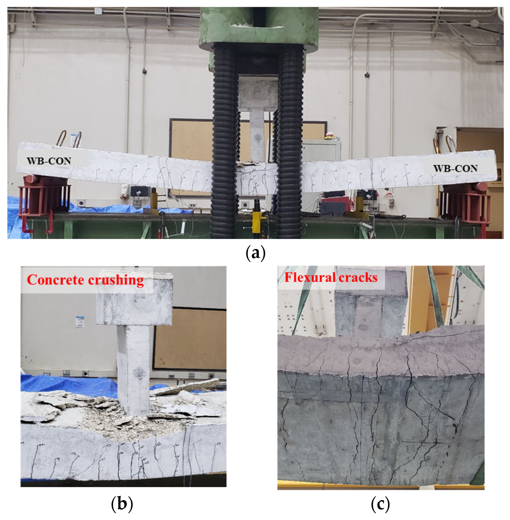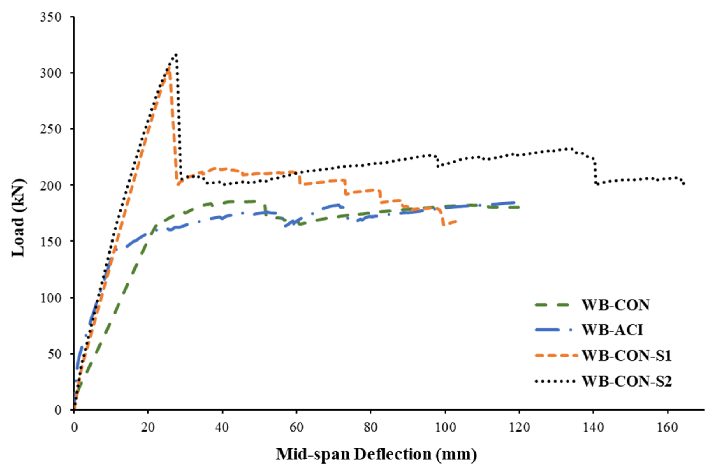 Figure 11 and Figure 12 illustrate the failure modes of the control specimens WB-CON and WB-ACI. Both beams exhibited the same flexural failure mode involving major flexure cracks at the beam’s mid-span. The flexural cracks appeared after yielding of the longitudinal rebars and progressed nearly vertically toward the beam’s top surface. As the deflections increased, the concrete in the compression region was crushed. The peak loads of both specimens were nearly identical, as the beams were designed to possess equivalent flexure capacities.