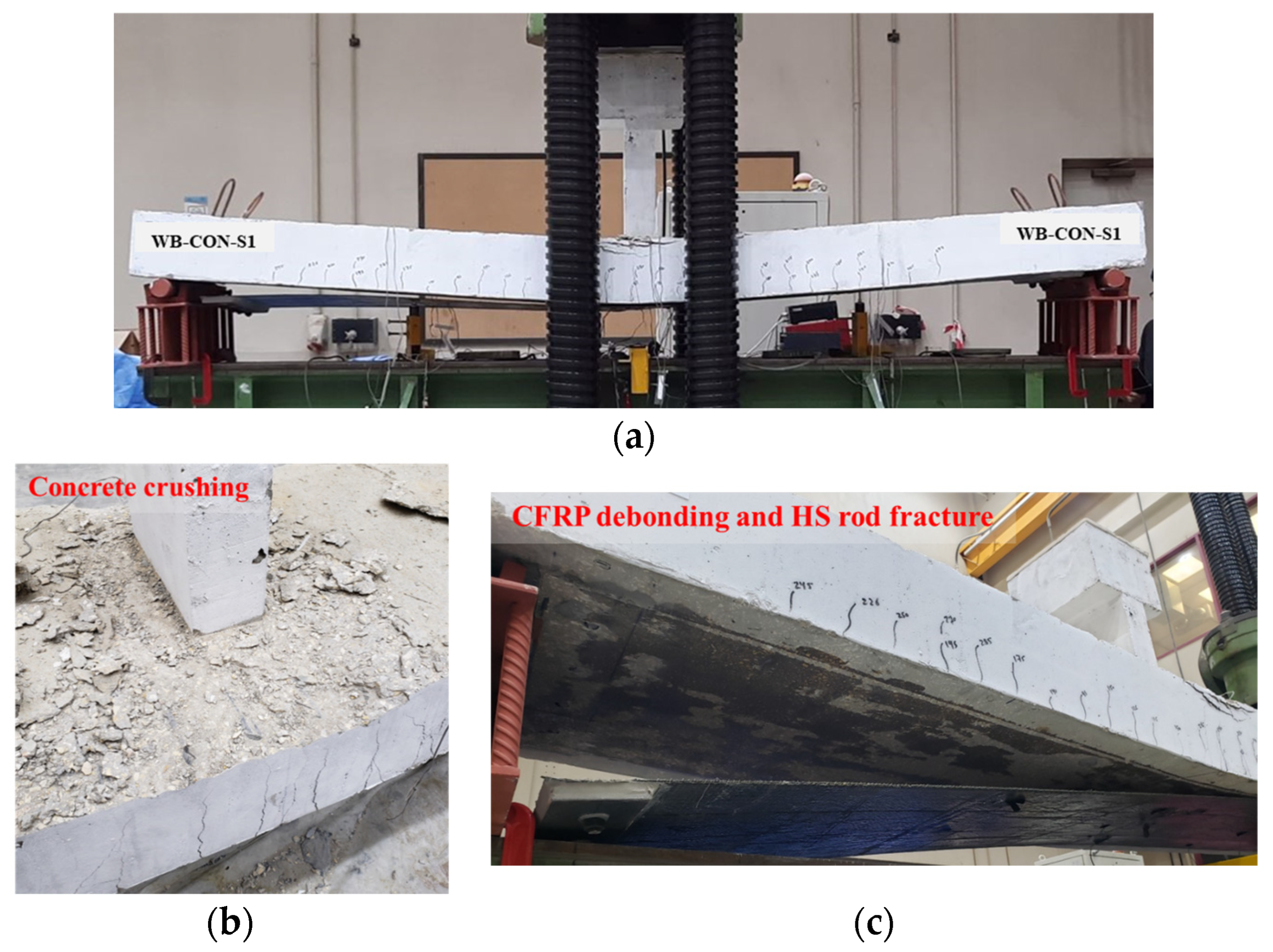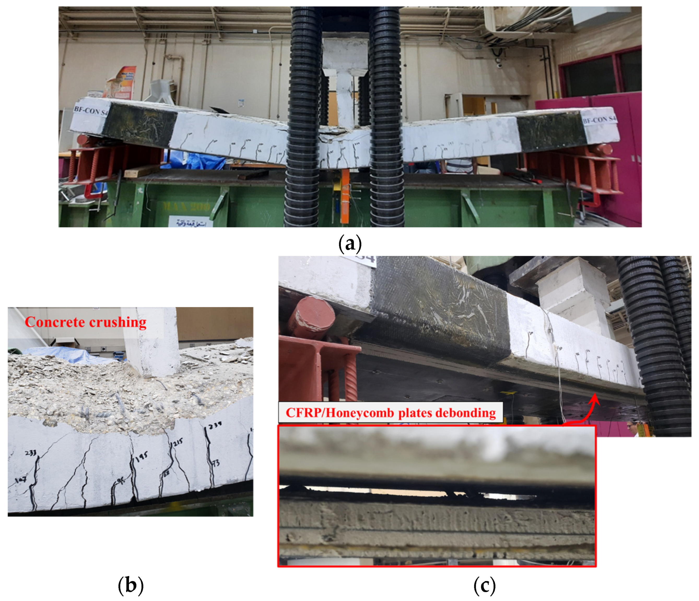 The beams were tested with the help of the AMSLER test machine (ZwickRoell, Switzerland) of 2000 kN total capacity, as illustrated in Figure 9. The tests were conducted by increasing deflection at 2 mm/min. A load cell, integrated into the testing machine, was used to record the applied load, which was exerted directly through the planted column. The clear span of simply supported beams was 3000 mm, with shear spans of 1500 mm on each side. Figure 9 also depicts the experimental setup and instrumentation layout. The deflection of the beam’s mid-span was recorded using 2 Linear Variable Displacement Transducers (LVDTs), with additional LVDTs positioned in each shear span. Furthermore, strain gauges were installed to monitor strain responses in the longitudinal and transverse rebars, CFRP sheets, and CFRP/honeycomb panels. The tests were conducted under monotonic loading; however, the loading was staged with brief pauses at selected load levels to allow for the marking of cracks and recording of observations. The monotonic loading was considered to focus on the fundamental load–displacement response, cracking patterns, and ultimate strength of the specimens under controlled conditions. Monotonic loading enabled precise measurement and observation of these behaviors without the additional complexity introduced by sustained or cyclic effects. While long-term sustained loads and cyclic/seismic loadings are relevant for serviceability and seismic performance, they were beyond the scope of the present study. However, future work is recommended to investigate the performance of similar specimens under time-dependent and cyclic/seismic loading conditions.