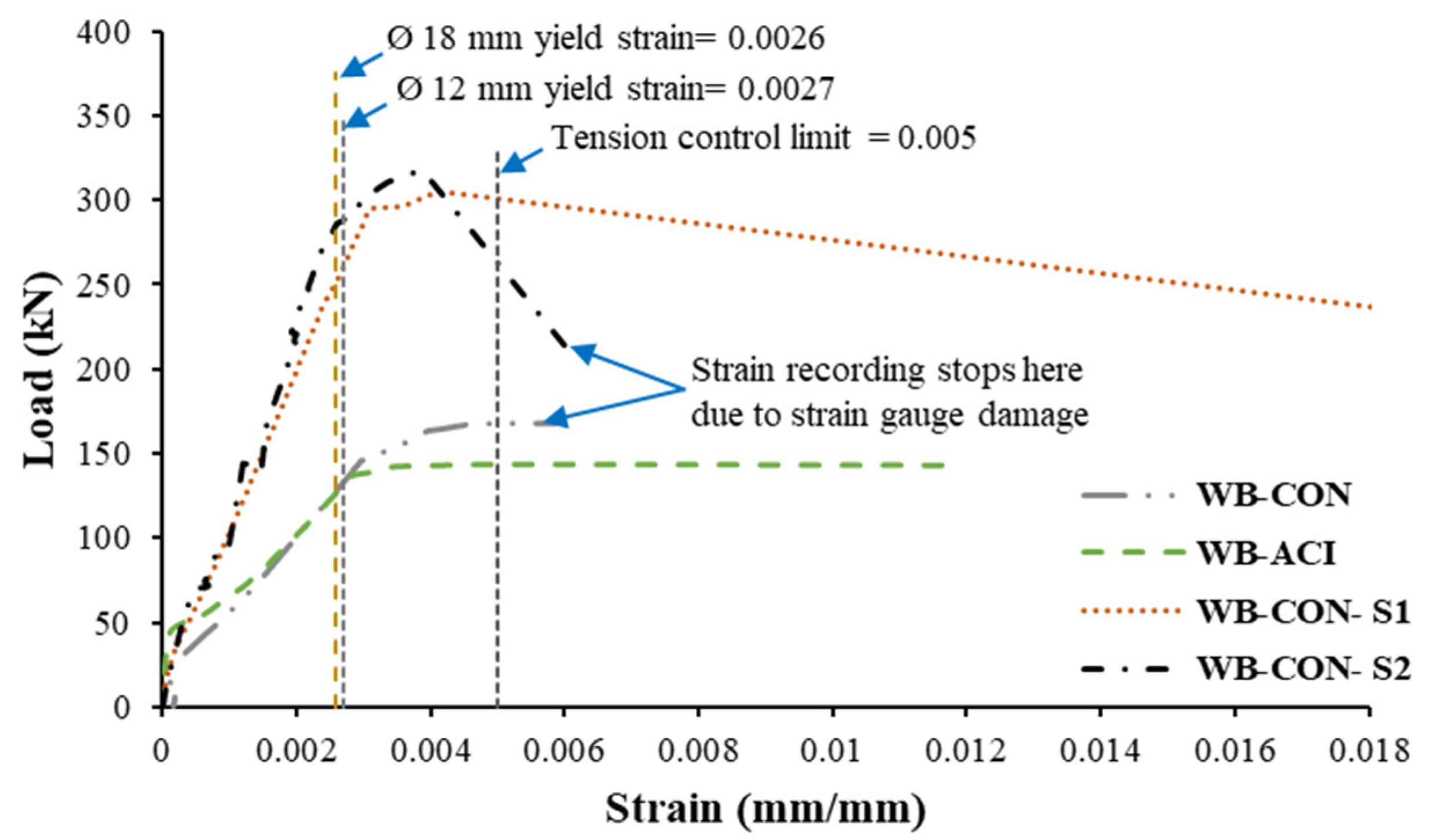 Thus, the two control specimens considered above both satisfy the code requirements for flexure and shear. However, only WB-ACI (Figure 3) satisfied the code deflection limit, whereas WB-CON (Figure 2) did not. Consequently, WB-ACI was constructed with a thickness of 300 mm and additional reinforcement, while WB-CON was limited to 200 mm thickness.