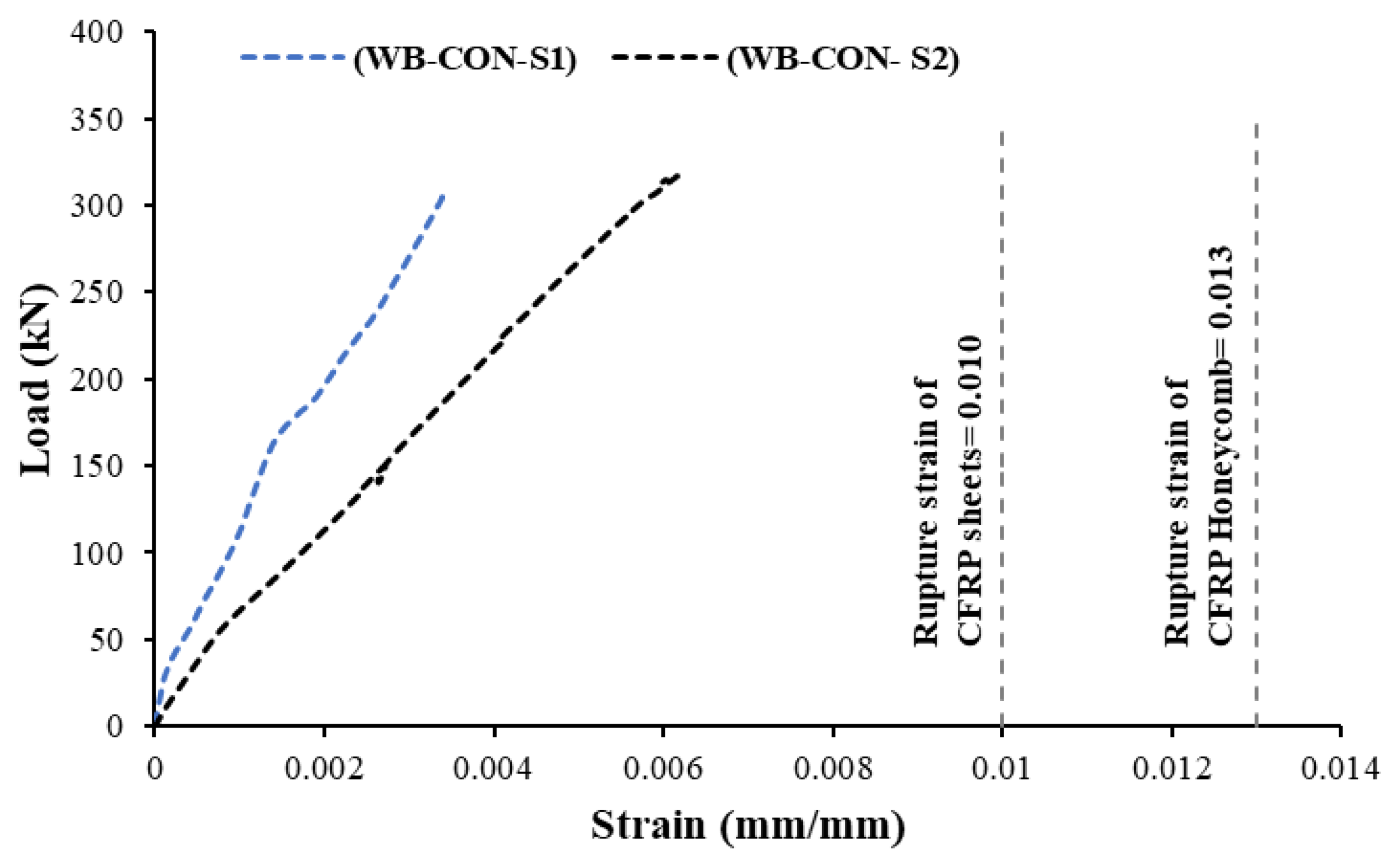 Figure 16 depicts the variation in rebar strains at mid-span against applied load for all tested specimens. As evident from the figure, all specimens met the tension-controlled behavior criteria specified in the current codes [45,46], as the maximum rebar strains are substantially greater than 0.5%. Additionally, the tensile reinforcement yielded prior to reaching the ultimate load in each case. Figure 17 presents the variation in strain at mid-span against load for CFRP sheets and CFRP/honeycomb plates for the strengthened wide beams WB-CON-S1 and WB-CON-S2, respectively. The peak strain in the CFRP sheet of the specimen WB-CON-S1 was significantly lower than its ultimate rupture strain. This is because the rupture of the CFRP sheet did not occur; instead, failure was governed by premature debonding, as previously discussed. Similarly, the peak strain recorded in the CFRP/honeycomb panels of the specimen WB-CON-S2 was markedly lower than the corresponding rupture limit. This is because of the premature debonding of the CFRP/honeycomb panels, which occurred before the panels reached their ultimate strain capacity.