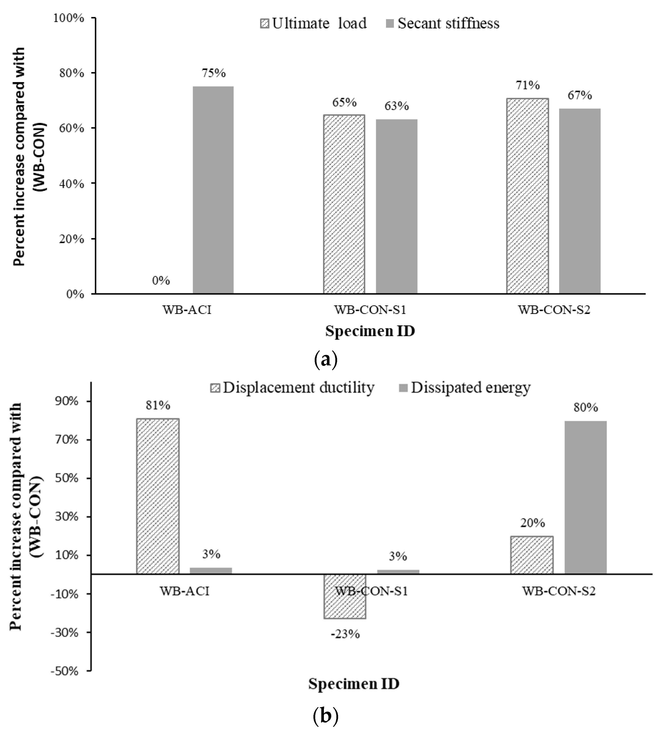 Both strengthened specimens, WB-CON-S1 and WB-CON-S2, demonstrated enhanced flexural performance in comparison to the control wide beam WB-CON. As illustrated in Figure 15, both strengthened specimens demonstrated higher load and stiffness, as a result of introducing the strengthening materials of CFRP sheets and CFRP/honeycomb plates. While both retrofitting techniques proved highly effective, a deeper comparison reveals critical differences in their structural behavior and failure mechanisms. Both WB-CON-S1 and the hybrid system WB-CON-S2 provided significant and comparable increases in flexural strength and stiffness. The secant stiffness for WB-CON-S1 and WB-CON-S2 increased by 63% and 67%, respectively, relative to WB-CON, successfully controlling deflection to within serviceability limits. The ultimate failure mode for both was also similar: yielding of the main tension steel followed by intermediate crack (IC) debonding of the external reinforcement and subsequent concrete crushing. However, the systems diverged significantly in their post-yield behavior. The most notable advantage of the hybrid system was its superior energy dissipation capacity and ductility. The inclusion of CFRP/honeycomb plates in WB-CON-S2 led to an 80% increase in dissipated energy and a 20% increase in displacement ductility when compared to the unstrengthened WB-CON beam. In contrast, the CFRP-only system in WB-CON-S1, while increasing its strength, resulted in a 23% reduction in ductility. The mechanism behind this enhanced performance in WB-CON-S2 stems from the composite nature of the honeycomb sandwich panels. The aluminum honeycomb core is specifically designed to absorb energy through the plastic deformation and crushing of its thin cell walls under high stress. This provides an additional energy dissipation path that is not available in the linear–elastic CFRP sheet system. Furthermore, the use of mechanical screw-bolts in WB-CON-S2, in addition to adhesive bonding, likely created a more damage-tolerant connection that helped to arrest the propagation of debonding, allowing the beam to undergo larger deflections post-yield and thereby extending the yielding plateau seen in Figure 15. This combination of material properties and connection detail explains the superior and more ductile performance of the hybrid strengthening strategy. Figure 18 depicts the percent increase in the evaluated parameters of test specimens compared to the control specimen WB-CON.