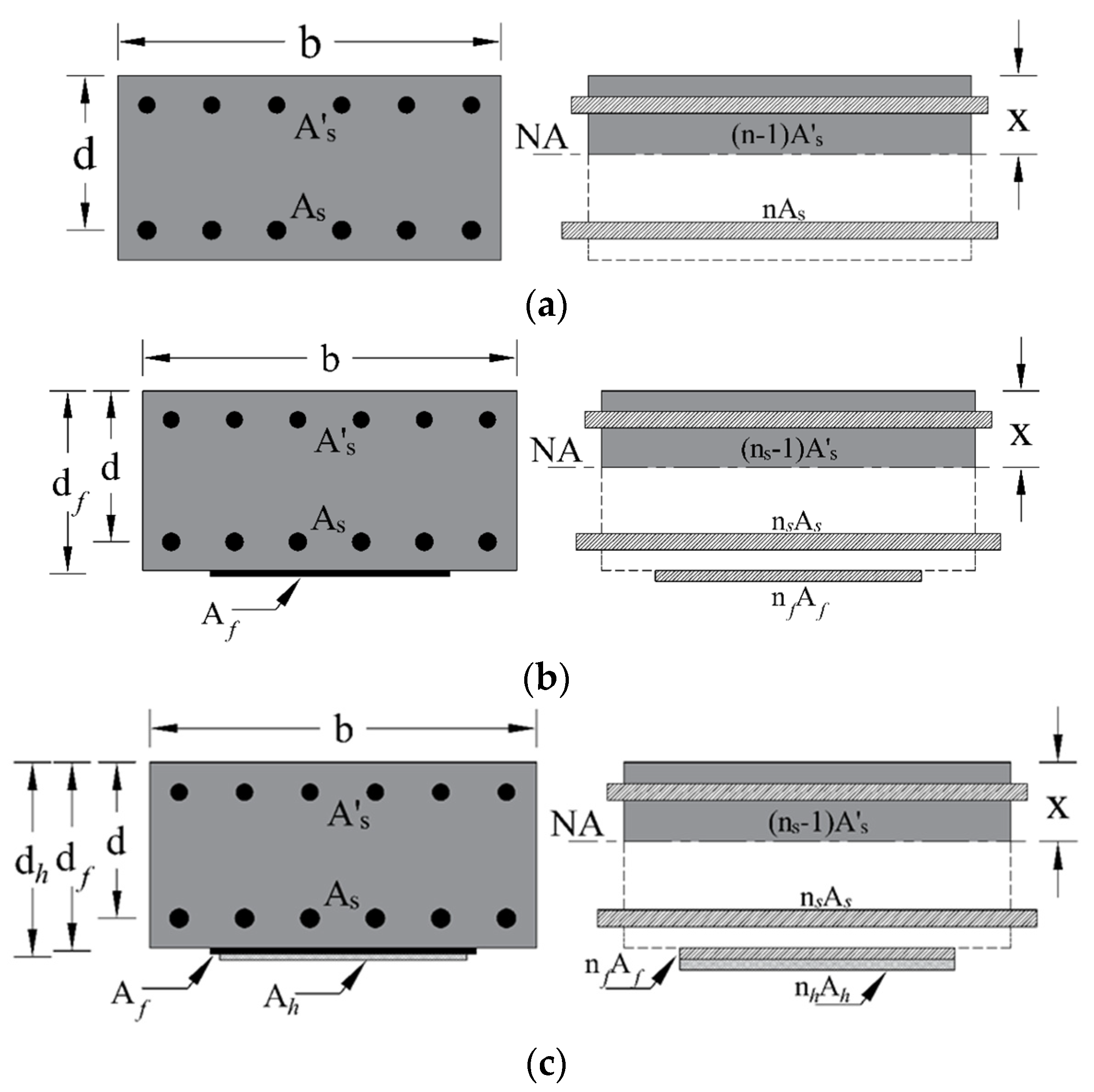 where F s is the compression steel force, F c i is the compressive force in ith layer of concrete, T is the tension steel force, F f is the CFRP sheet force, and F h is the CFRP/honeycomb panel force. These forces can be calculated as