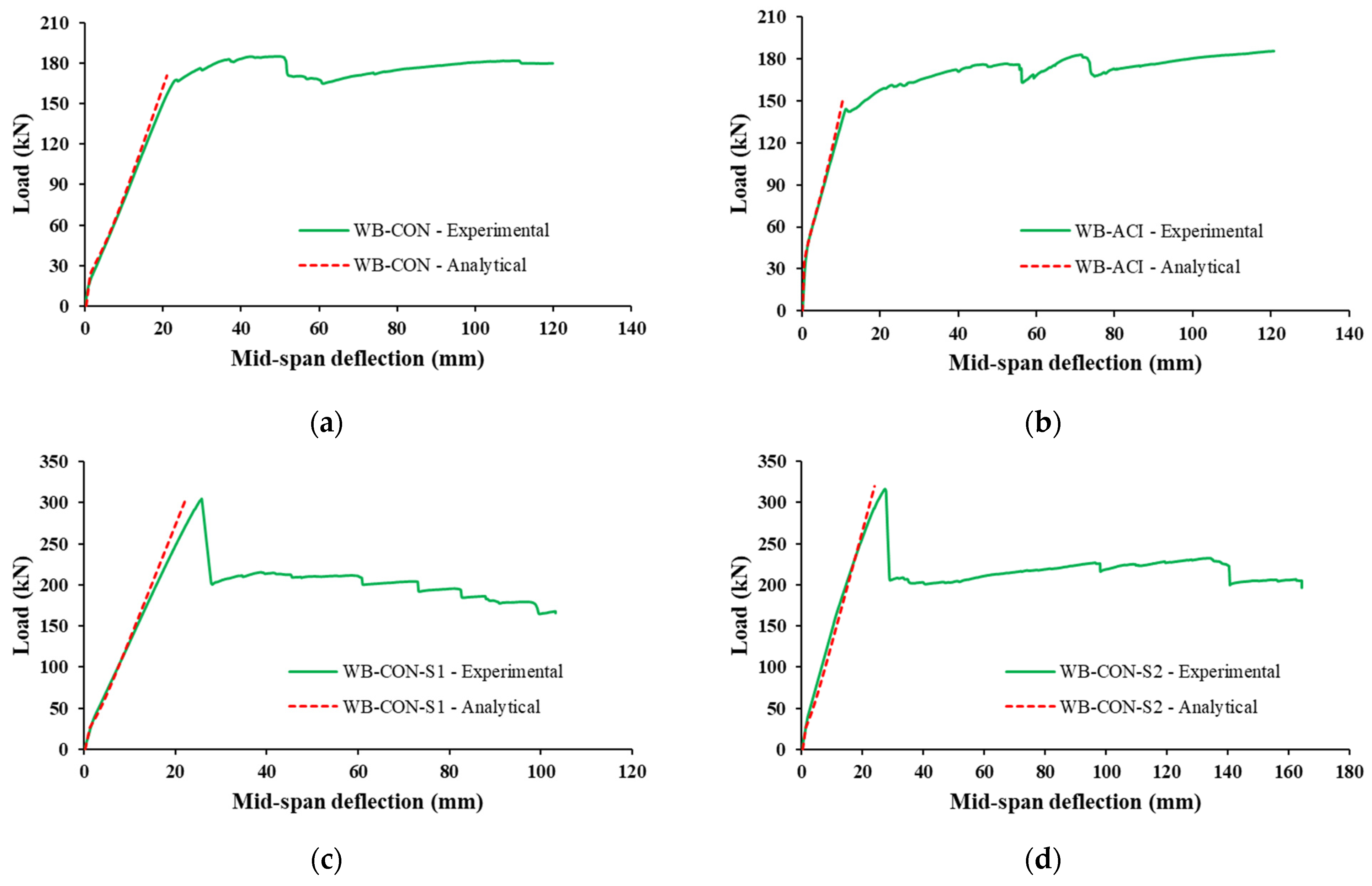 Figure 15 presents the load–deflection responses of the tested specimens. Both control specimens exhibited typical behavior associated with tension-controlled reinforced concrete (RC) beams, characterized by a trilinear load–deflection relationship as depicted in Figure 10 and Figure 15. The initial linear segment corresponds to the uncracked stage, marked by relatively high stiffness, where the entire uncracked concrete section and steel reinforcement work together to resist the load. Thus, the stiffness is at its maximum, defined by the beam’s gross moment of inertia. Following the onset of concrete cracking, the first significant drop in stiffness occurs upon the initiation of flexural cracks in the concrete’s tension zone. At this point, the tensile stresses are transferred to the steel reinforcement and the externally bonded strengthening system. The stiffness is now dictated by the cracked transformed section’s moment of inertia, resulting in a reduced slope on the load–deflection curve. The third segment of the load–deflection response began when the second major stiffness degradation occurred, when the main tensile steel reinforcement yielded. Beyond this point, the beam’s behavior is characterized by a yielding plateau, where large deflections occur with small increments in load. The resistance is primarily provided by the strain hardening of the steel and the linear–elastic behavior of the CFRP reinforcement, which continues to carry increasing tensile stress until the ultimate failure of the system. The control specimen, WB-ACI, demonstrated substantially higher stiffness throughout the test in comparison to WB-CON. This enhanced performance is attributed to the design of WB-ACI in compliance with current code-specified deflection limits [45,46]. Both strengthened beams (WB-CON-S1 and WB-CON-S2) exhibited higher stiffness in comparison to the control beam WB-CON and approximately the same stiffness as the control specimen WB-ACI. As seen from Figure 15, the strengthened WB-CON-S2 has a more yielding plateau compared to the strengthened beam WB-CON-S1. This is due to the introduction of CFRP/honeycomb plates, which added more ductility to the beam.