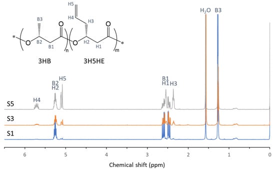 The 400 MHz 1H NMR spectra of P(3HB-co-3H5HE). The 3H5HE fractions of samples S1, S3, and S5 are 3 mol%, 19 mol%, and 47 mol%, respectively.