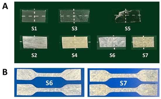 (A) Appearance of P(3HB-co-3H5HE) and vulcanized P(3HB-co-3H5HE) films (approximately 10 mm × 5 mm × 0.05 mm). (B) Dumbbell-shaped film (gauge length: 10 mm, width: 2 mm, film thickness: approximately 0.05 mm) for mechanical property measurements (samples S6 and S7).