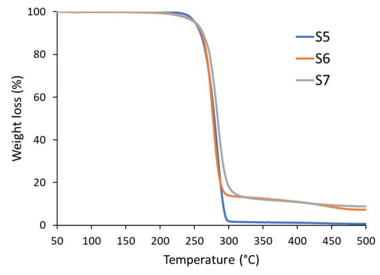 Thermogravimetry analysis (TGA) curves of samples S5, S6, and S7.