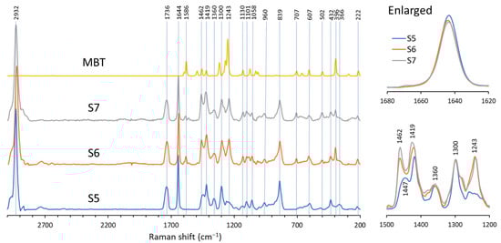 Raman spectra of samples S5, S6, S7, and MBT.