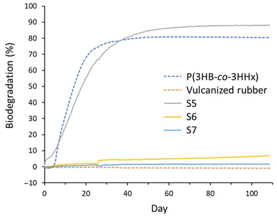 The biodegradation profiles of the samples over 108 days are shown in Figure 6. The samples included non-vulcanized P(3HB-co-5 mol% 3HHx), vulcanized rubber (prepared from poly(1-methyl-1-butene-1,4-diyl)), and three P(3HB-co-47 mol% 3H5HE) samples (S5, S6, and S7). The theoretical oxygen demand for vulcanized rubber was derived from the empirical formula for pure rubber (C5H8). In contrast, for S5, S6, and S7, the ThOD values were calculated based on elemental composition and empirical formulas. Over the 108-day test period, S5 (non-vulcanized) and P(3HB-co-5 mol% 3HHx) exhibited high biodegradation, reaching 88.1% and 80.4%, respectively. This confirmed the inherent biodegradability of PHA-based materials. In contrast, vulcanized rubber exhibited negligible biodegradation, remaining at approximately 0% throughout the experiment due to the oxygen demand of vulcanized rubber being slightly lower than that without polymer (blank). Among the vulcanized P(3HB-co-3H5HE) samples, S6 (containing 5 phr sulfur) exhibited limited biodegradation, reaching 7.0%. Sample S7 (containing 20 phr sulfur) showed even lower biodegradation at only 1.6%. These results indicate that vulcanization significantly hinders the biodegradation process, likely because of the formation of cross-linked networks that are resistant to microbial enzymatic attacks. Nevertheless, both vulcanized PHAs (S6 and S7) demonstrated slightly greater biodegradability than the vulcanized rubber. These findings suggest that, although vulcanization reduces the biodegradability of polymers, vulcanized P(3HB-co-3H5HE) retains low biodegradability.