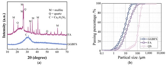 Physical and chemical property parameters of raw materials: (a) XRD patterns of FA and GGBS; (b) particle size distribution of raw materials.