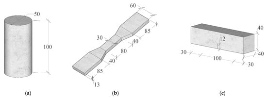 Specimen dimensions (unit: mm): (a) cylinder specimen for compressive tests; (b) dumbbell-shaped specimen for tensile tests; (c) pre-notched specimen for fracture tests.