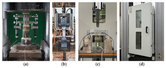 To evaluate material behavior under axial compression, a 500-ton capacity compression testing machine was used (Figure 3a). Before testing, the top and bottom loading surfaces of each specimen were cleaned and leveled with high-strength gypsum to ensure an even stress distribution. The lateral surfaces were also polished to allow the proper attachment of strain gauges. Axial strain was measured using strain gauges symmetrically bonded to the specimen sides. In addition, two linear variable differential transformers (LVDTs), with a 50 mm gauge length, were installed symmetrically to capture axial deformation. The test was conducted under displacement control at a constant rate of 0.2 mm/min. Throughout the test, axial load, strain, and deformation were recorded in real time using a high-precision data acquisition system, with a sampling rate of 1 Hz.