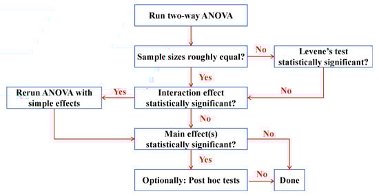 Figure 4 illustrates the flowchart of the analysis of variance (ANOVA) performed using IBM SPSS Statistics 27 in this study. A two-way ANOVA was conducted to evaluate the effects of fiber hybrid ratio and coupling temperature on fracture properties of HDAAC in this study. All individual specimen data were included to capture within-group variability. The analysis examined the main effects and the interaction between the two factors mentioned above. Afterwards, post hoc tests were conducted for factor A (fiber replacement ratio: 0%, 25%, and 50%) and factor B (coupled temperature: 0 °C, 30 °C, 70 °C, 100 °C, and 150 °C) using the Bonferroni test, with p < 0.05 as the significance threshold (“p < 0.001” considered highly significant). Letter groupings were then assigned to each factor level: identical letters indicate no significant difference (p ≥ 0.05), while different letters indicate a significant difference (p < 0.05). Overlapping letters (e.g., “ab,” “bc”) denote no significant difference with multiple groups, although some pairwise differences may still exist. The letters for factor A and factor B are presented sequentially after each mean ± SD in the format (a, b), corresponding to the main effects of fiber replacement ratio and temperature, respectively. It should be noted the valid samples in this study are fixed at 3, and the sample sizes are roughly equal. The results will be shown in Section 3.3.