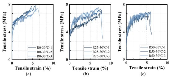 Stress–strain curves of hybrid PP/PE-HDAAC under tension: (a) R0-30 °C; (b) R25-30 °C; (c) R50-30 °C.