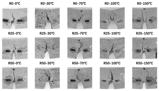 Figure 6 illustrates the failure modes of notched specimens, with the images being processed for better understanding. As shown in Figure 6, all specimens developed a prominent main crack within the fracture process zone under the combined effects of thermal and mechanical loading, accompanied by numerous fine surrounding cracks. Initially, cracking began at the prefabricated notch tip at the onset of loading, though the crack was barely visible. As loading gradually progressed, the main crack slowly propagated along the notch direction, while a growing number of microcracks emerged around the crack tip. Fiber pull-out and rupture occurred during the whole process. In addition, the surface of the main crack was irregular and curved, increasing the fracture surface area and reducing stress concentration at the crack tip []. Eventually, as the fiber-bridging capacity weakened, both the main crack and adjacent microcracks expanded rapidly, resulting in complete specimen failure. It should be noted that crack patterns varied noticeably with temperature. At 0 °C, crack propagation was restrained, leading to narrower main and secondary cracks. At 70 °C and 100 °C, the number of microcracks increased substantially, indicating enhanced ductility. At 150 °C, despite the thermal degradation of the fibers—including melting damage and reductions in elastic modulus and tensile strength—a residual bridging effect persisted. As a result, multiple cracks around the main crack were still evident.
