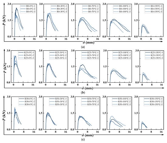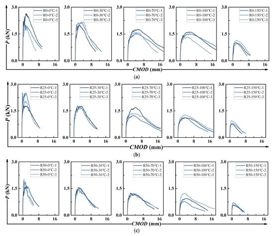 P-CMOD curves: (a) R0 group; (b) R25 group; (c) R50 group.