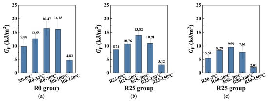 Variation in mode I fracture energy GF: (a) R0-30 °C; (b) R25-30 °C; (c) R50-30 °C.