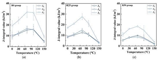 Similarly, an increased coupled temperature led to a more obvious ductile fracture mode, specifically resulting in an increase in Jm and Jb. As mentioned above, Jm represents the consumed energy of matrix cracking, while Jb represents the consumed energy related with fiber pull-out and fracture. From Figure 11, both Jm and Jb increased as coupled temperature ascended and peaked at 70 °C. For instance, the Jm of R0-70 °C was approximately two times that of R0-0 °C. However, the Jm of R0-150 °C declined to nearly 25% of that of R0-70 °C. Similar patterns were observed in terms of Jb as well. For another, Jm and Jb showed a decreasing trend with an increasing PP fiber replacement ratio. Still, the descent of Jm and Jb was moderate. For example, the Jm and Jb of R25-30 °C decreased by 13.6% and 14.1%, respectively. However, the Jm and Jb of R50-30 °C decreased by 35.7% and 32.2%, respectively. Notably, it can be observed that the values of Jm and Jb was nearly kept at the same level (Jm/Jc = 0.4–0.5), which was distinguished from conventional concrete and FRC.