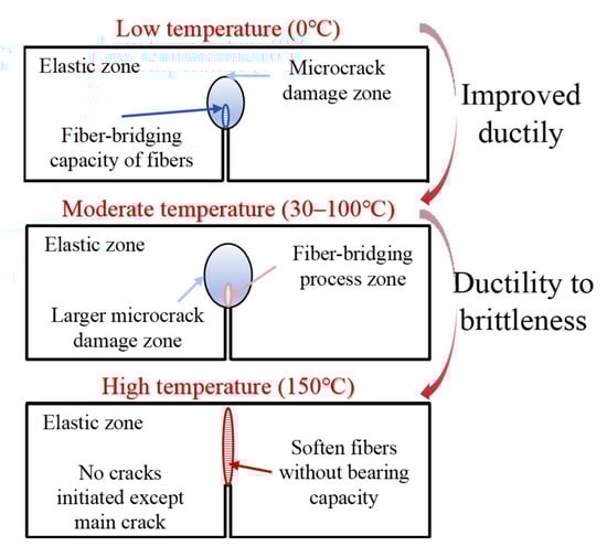 Although few studies have examined the fracture behavior of HDAAC under thermo-mechanical coupling, some studies have explored its residual mechanical properties after high-temperature exposure. These studies suggested that moderate heating could enhance compressive strength by promoting the further activation of fly ash (FA) particles []. However, at higher temperatures, compressive strength declined due to fiber melting, which led to pore formation, microcracking, and matrix void growth [,]. Moreover, the tensile and flexural properties of HDAAC were reported to be sensitive to temperature because the mechanical behavior of both the matrix and fibers changes as temperature increased []. These findings highlight that the combined effects of heat and mechanical loading—particularly on the matrix, fibers, and their interface—are key to understanding how HDAAC performance is enhanced or degraded. As such, the fracture behavior of HDAAC under thermo-mechanical coupling likely differs significantly from its post-heating response and better represents actual service conditions. In most existing studies, specimens were tested after being cooled from a target temperature. However, this approach did not accurately reflect real service conditions, where HDAAC were often subjected to simultaneous loading and high temperatures. Some researchers compared residual specimens (tested after cooling) with quasi in situ specimens (tested while still hot), finding that the latter exhibited a lower tensile strength. This difference was ascribed to a reduced fiber–matrix bond strength at elevated temperatures []. For example, Constâncio Trindade et al. [] observed a greater strength loss in specimens tested while hot. In summary, far less attention has been given to the fracture behavior of HDAAC under thermo-mechanical coupling, where heat and load act simultaneously.